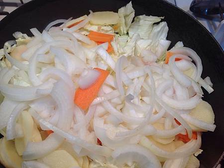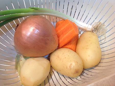接著準備配菜,洋蔥一顆, 紅蘿蔔1條,青蔥2條, 小馬鈴薯 3~4顆,高麗菜 1/4 顆.