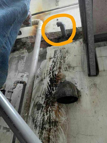 前些日子樓下阿尚喊說,誰一直倒水弄污了她位於防火巷的廚房牆面。 原來彎管瀉出污水?